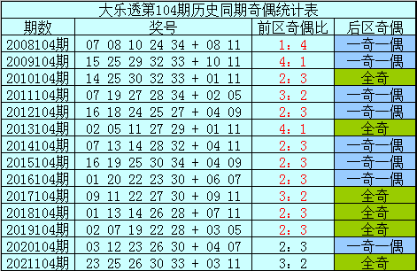 后区分析:在第104期历史同期开奖中,后区奖号奇偶比为20:8,最近5年同期后区奇偶走势为:全奇、全奇、全奇、一奇一偶、全奇,今年同期预计奇数号码大热,关注两码04、05。