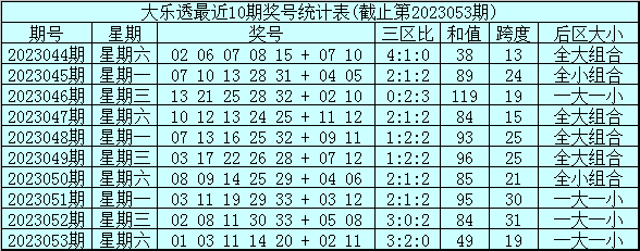 大乐透第2023053期奖号为,前区:01、03、11、14、20;后区:02、11。其中前区奖号三区比为3:2:0,和值为49,跨度为19,后区开出一大一小组合。