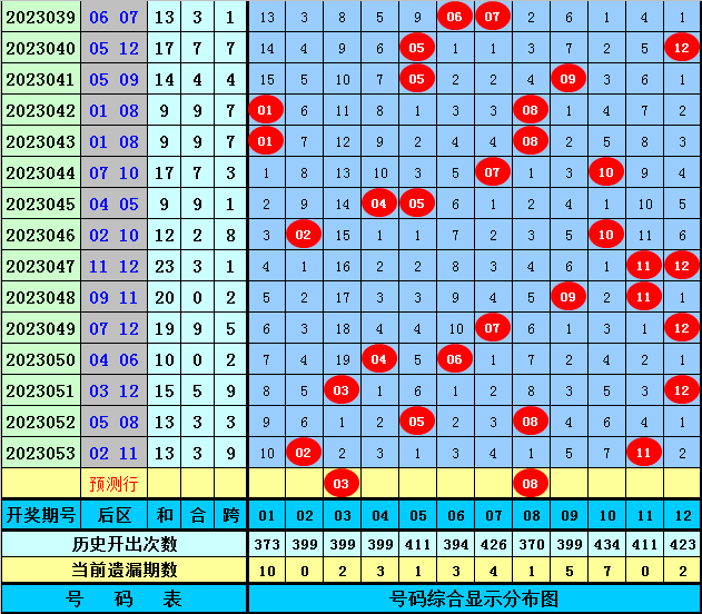 后区分析:上期后区两码开出02+11,为一大一小组合,近50期后区全大组合出现13次,全小组合出现11次,一大一小组合出现26次,,近10期后区全大组合出现4次,全小组合出现2次,一大一小组合出现4次,本期预计后区一大一小组合再出,参考号码03、08。