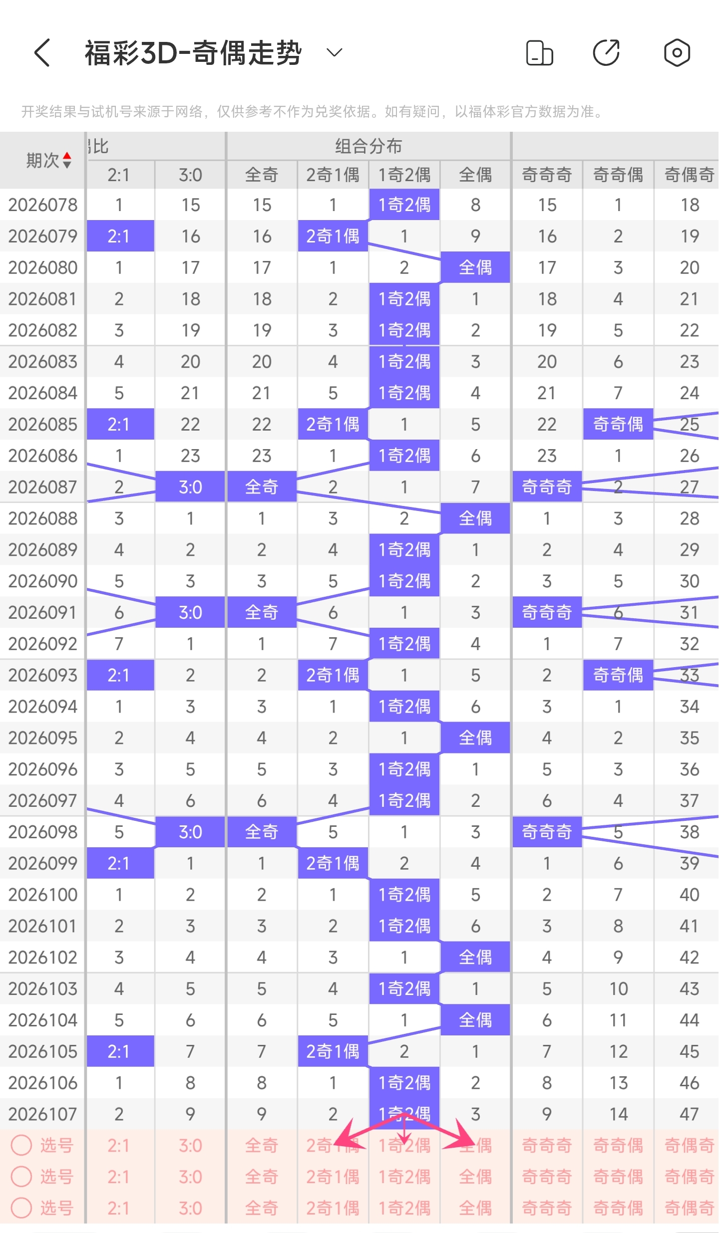 上期开了1奇2偶的情况,往前一期开出的是1奇2偶。从组合数学理论上来讲,开出2奇1偶和1奇2偶的概率都为37.5%,开出全偶和全奇的概率为12.5%。通过分析目前30期内的数据。本期的开出全偶的概率是16.66%,开出全奇的概率为10%,开出1奇2偶的概率为56.66%,开出2奇1偶的概率是16.66%。和前一期相比,1奇2偶概率变大,2奇1偶概率变小。通过走势图分析,上期开了1奇2偶,推测本期可能会开全奇或者1奇2偶,然后是2奇1偶和全偶类型。