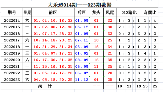 开奖回顾:大乐透第2022023期奖号:04 05 18 20 25 + 11 12,前区和值72,跨度21,后区和值23,跨度1。