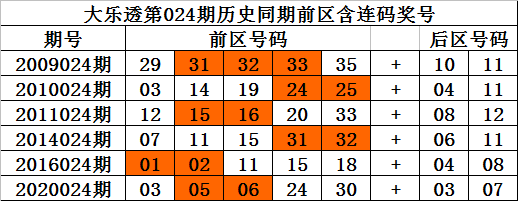 6。重号:历史同期上一年重号出现4次,重号出现比例较低,今年同期防重号回补,关注去年同期奖号24。