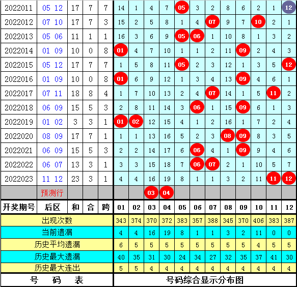9。在历史同期奖号中,后区号码04出现6次;11出现4次;03 07 08出现3次;01 02 09 10 12出现2次;06出现1次;05历史同期没有出现。