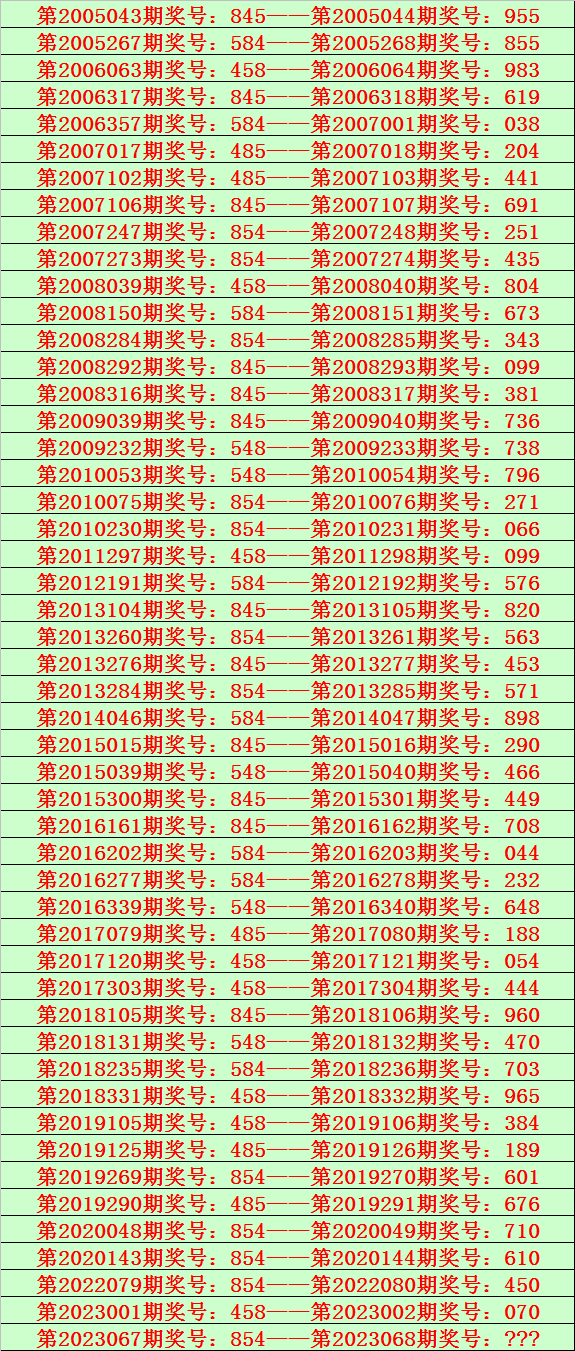 排列三第2023067期开出奖号854,该号码历史上组选出现50次,前49次开出之后期下期奖号为:955、855、983、619、038、204、441、691、251、435、804、673、343、099、381、736、738、796、271、066、099、576、820、563、453、571、898、290、466、449、708、044、232、648、188、054、444、960、470、703、965、384、189、601、676、710、610、450、070,详见下表: