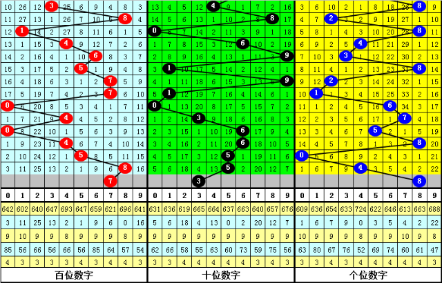 其中,百位奇偶比为4:7,大小比为5:6,本期百位一码参考7。