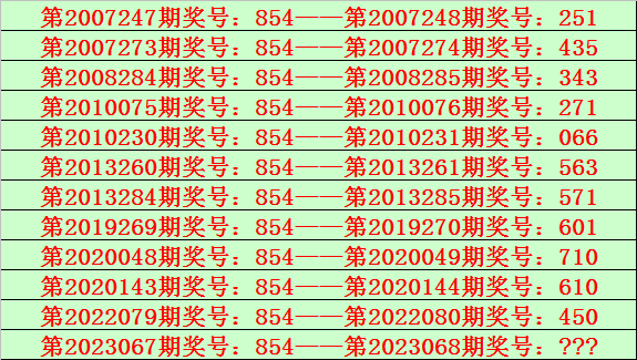 排列三第2023067期开出奖号854,该号码直选类型历史上出现了12次,前11次开出之后期下期奖号为:251、435、343、271、066、563、571、601、710、610、450,见下表:
