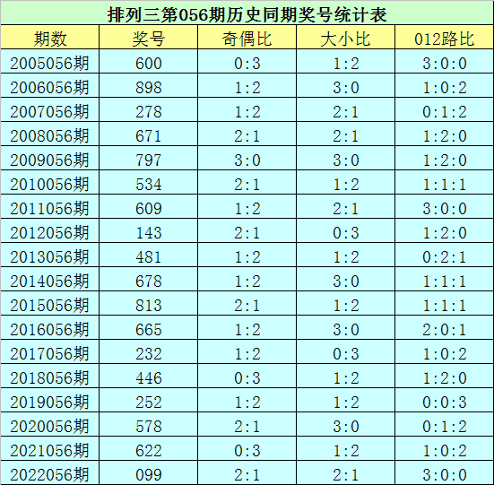 排列三第2023056期开奖日期:2023年3月7日,历史上第056期已开出了18次奖号,历年同期号码分别为:600、898、278、671、797、534、609、143、481、678、813、665、232、446、252、578、622、099。