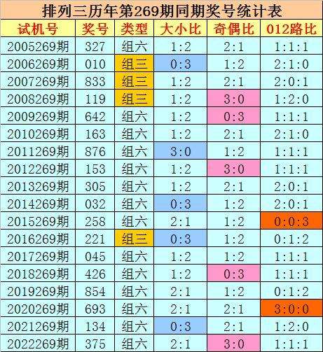 奇偶分析:历史上排列三第269期同期奖号中,奇偶比0:3出现2期,奇偶比3:0出现3期,奇偶比2:1出现6期,奇偶比1:2出现7期,奇偶奖号总比例开出28:26,奇数号码相对活跃,今年第269期预计奇数号码再次走热,关注奇偶比为2:1。
