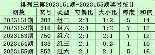 上期回顾:排列三第2023155期开奖号码为853。奖号类型为组六,奇偶比为2:1,大小比为2:1,跨度为5,和值为16。
