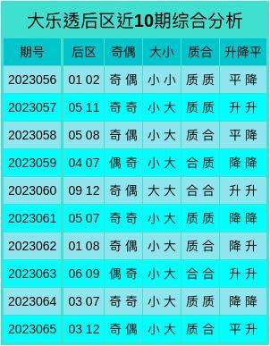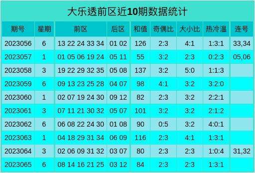 上期回顾:大乐透第23065期开出奖号:前区08 14 16 21 25,后区03 12,其中前区和值为84,跨度17,大小比为2:3,后区开出小大、奇偶数号码,和值为15,跨度为9。