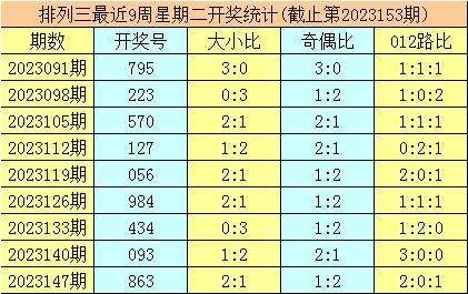 三、体彩排列三前9周星期二奖号分别开出:795-223-570-127-056-984-434-093-863,其中号码012路比为12:7:8,奇偶比为14:13,大小比为13:14;