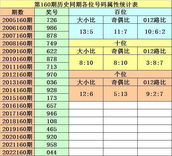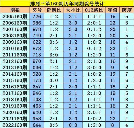 开奖回顾:排列三第2023159期开出奖号319,奖号012路比为2:1:0,大小比为1:2,奇偶比为3:0,最近三年第160期同期开出奖号为:第2020160期:920、第2021160期:958、第2022160期:044。