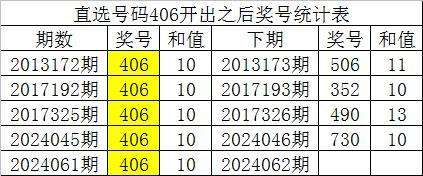 一、上期回顾:福利彩票3D第2024061期开奖结果:奖号为406,奖号和值为:10,奖号跨度为:6。