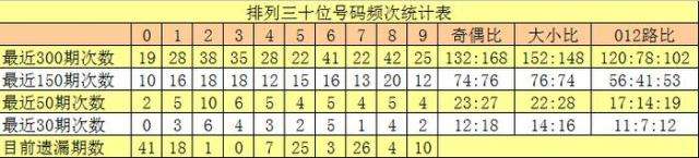 十位号码:前50期走势最活跃的号码为:2开出10个,3开出6个,1、4、6、8开出5个;走势最冷的号码为:0开出2个,5、7、9开出4个。十位号码012路比开出17:14:19,大小比开出22:28。本期十位排除两码:2、8,参考号码1、4、9,胆码关注4。