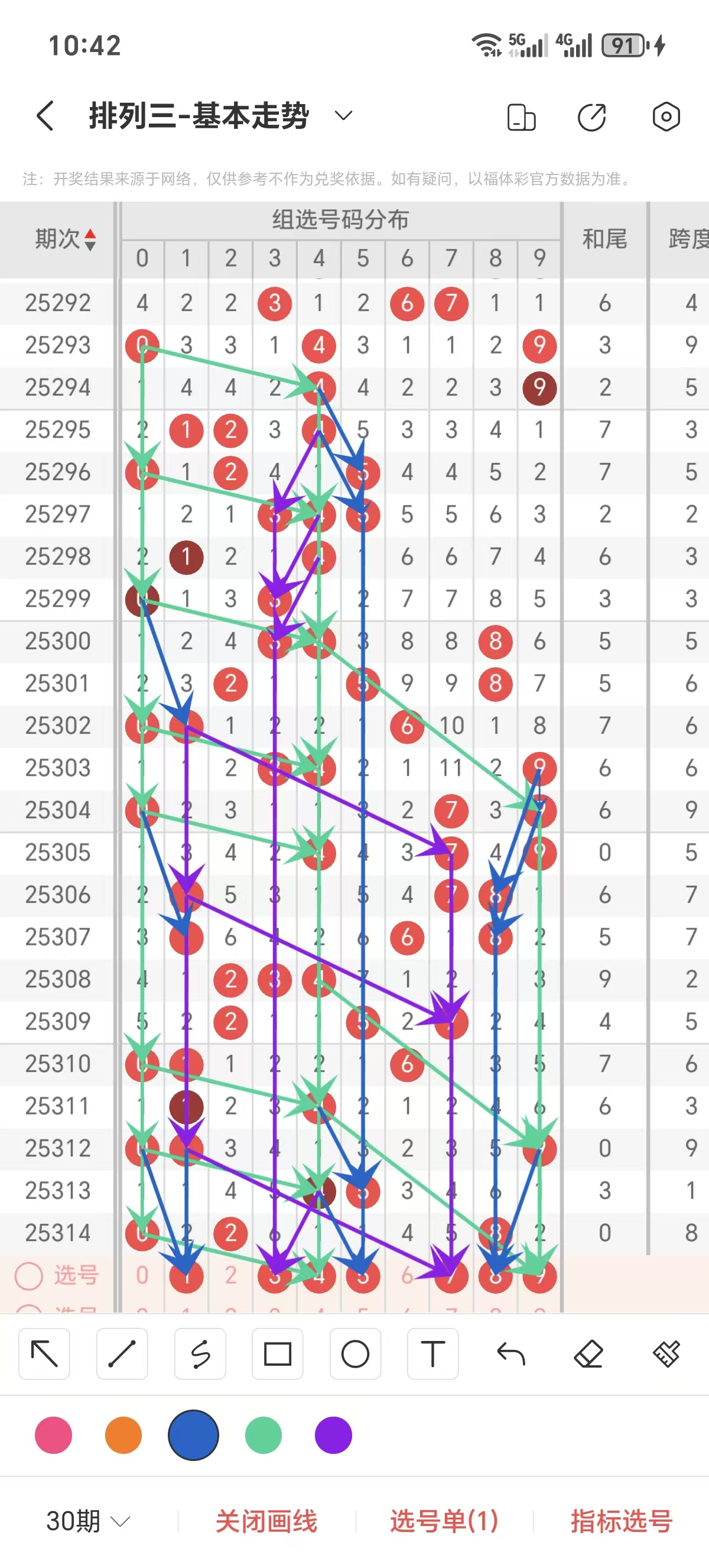 通常情况下在五期之内重复一个跨度的概率较高,近五期没有重复的跨度,近五期跨度为6/3/9/1/8,近期0路的跨度较热,本期要侧重6/7/8跨为主的号码组合。选择好跨度就可以从跨度方面选择相应的双胆码组合,双胆码的选取要根据近期和历史的走势进一步的分析选取。