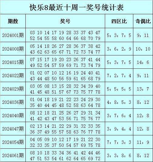 福彩快乐8第2024061期(上周一)开奖回顾:08 10 18 33 34 36 41 42 44 46 47 51 53 54 61 62 64 65 69 72,其中奖号四区比为3:3:8:6奇偶比为8:12。