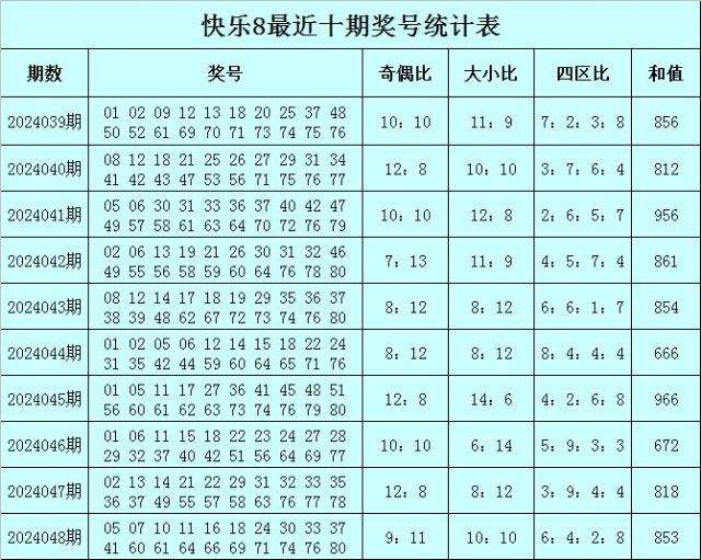 福彩快乐8第2024048期开奖回顾:05 07 10 11 16 18 24 30 33 37 41 60 61 64 66 69 71 74 76 80,其中奖号四区比为6:4:2:8,奇偶比比为9:11,大小比为10:10,和值为853。