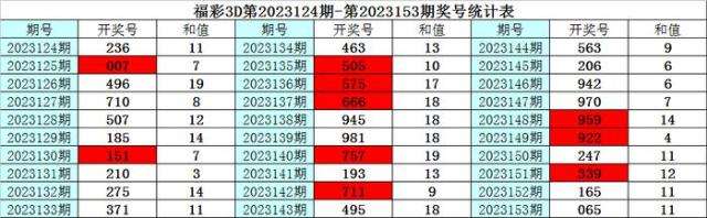 上期回顾:福彩3D第2023153期奖号为:065,其中奖号组选类型为:组六,奇偶比为1:2,大小比为2:1,012路比为2:0:1,和值为11,跨度为6。