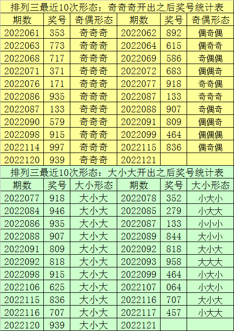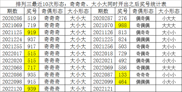 排列三最近10次同时开出奇偶形态:奇奇奇和大小形态:大小大时其奖号分别为:519-719-919-937-917-515-515-717-935-915-939,下期分别开出号码为:276-988-813-824-503-729-492-586-133-464,详细统计见下表: