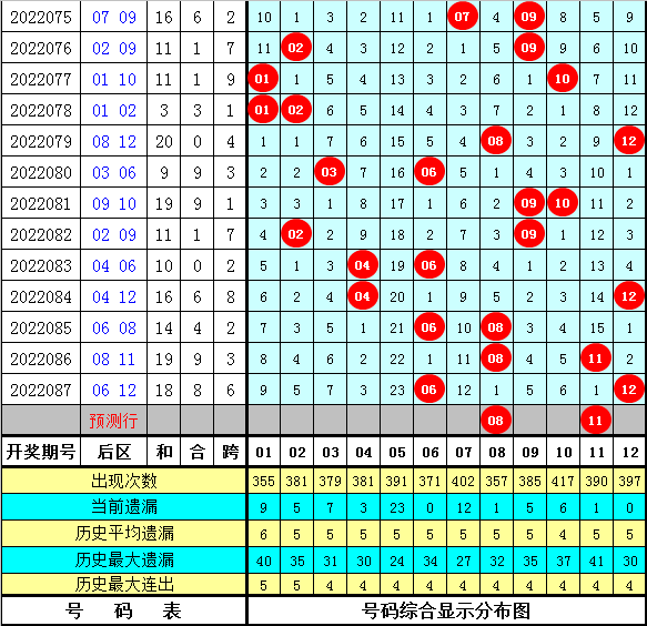 在历史同期奖号中,后区奖号跨度尾数大小比为7:8(定义:跨度1、2、3、10、11为小尾跨度,跨度4、5、6、7、8、9为大尾跨度),开出出现基本相等,本期看好小尾跨度出现,参考跨度3。