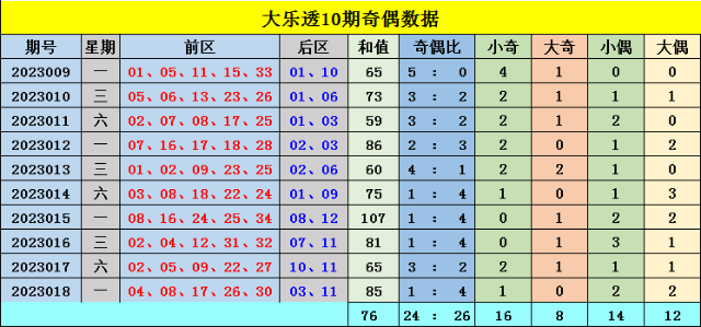 最近10期后区出现的奇偶比为12:8,大小比为9:11。