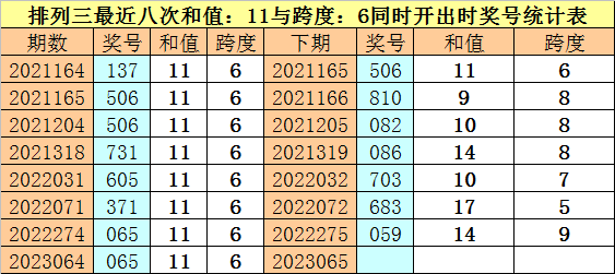 体彩排列三最近八次同时出现和值:11与跨度:6的奖号分别为:137、506、506、731、605、371、065、065,前七次下期开出奖号分别为:506、810、082、086、703、683、059,详见下表: