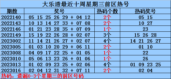 热号:最近十周星期三前区开出22个热号,上周星期三前区开出2个热号,本周星期三注意热号22。