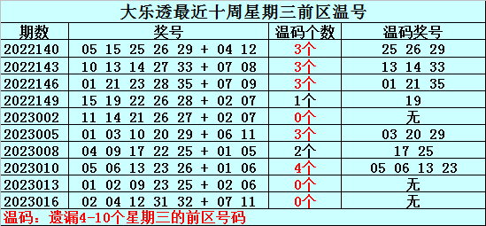 冷号:最近十周星期三前区开出9个冷号,上周星期三冷号出现3个,本周星期三注意冷号30。