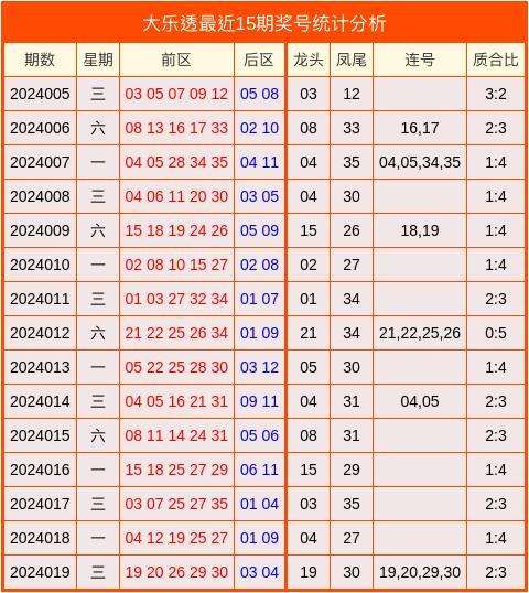 开奖回顾:大乐透第2024019期奖号:19、20、26、29、30+03、04。其中龙头为19,凤尾为30,质合比为2:3,开出2组连号19,20,29,30。