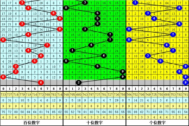 组选分析:在0-9的组选分布图中,最近10期0-2区段开出8个号码,3-6区段开出11个号码,7-9区段开出11个号码,上期3-6区段轮空,本期看好各区间分别开出1个奖号,