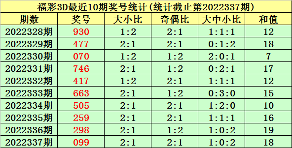 开奖回顾:福彩3D第2022337期奖号为:099。奖号类型为组三,和值为18,奇偶比为2:1,跨度为9,012路比为3:0:0,大小比为2:1。