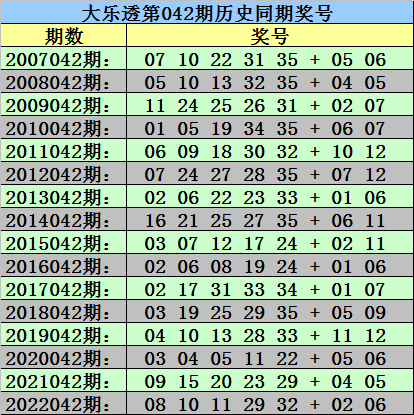 1、历史上大乐透第042期开出了16次,从2007年-2022年;