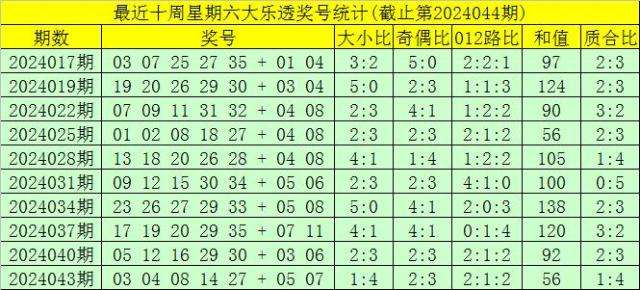 第2024044期大透乐星期六奖号分析: