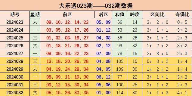大乐透24032期开奖,本期奖号:红球05、15、26、33、35蓝球01、09。当期红球号码三区比为1:1:3,奇偶比为4:1。形态方面,红球开出边号35重号15。