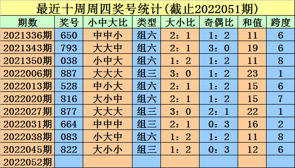 奖号类型判断:近期周四组六开出较少,当期遗漏1周,组三出现较多,本周四重点关注组六号码。