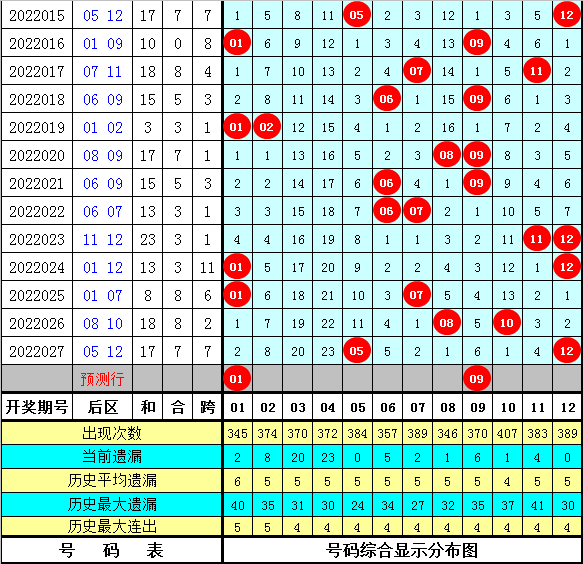 后区分析:上期后区奖号为05+12,本期后区注意重复号码出现,大范围参考号码01、03、05、09。