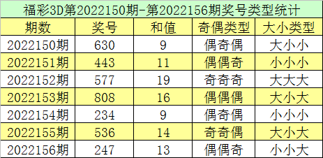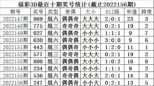 福彩3D第2022156期回顾:奖号为247,奖号奇偶比为1:2,大小比为1:2,和值为13,类型为组六。