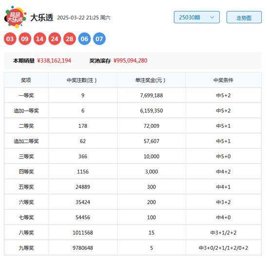大乐透第2025030期奖号开出:03 09 14 24 28+06 07。其中前区三区比为2:1:2,和值为78,包含1个重号:09,没有开出连码,后区开出一奇一偶、一大一小奖号。