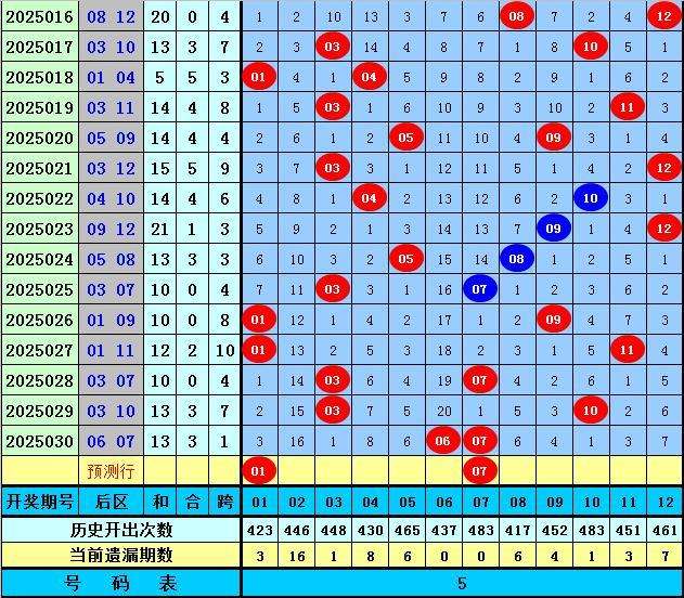 后区分析:上期后区开出一奇一偶、一大一小奖号06、07,近10期后区奖号奇偶比为13:7,奇数号码走势较热,后区奖号大小比为11:9,大小 号码开出个数基本相等,本期预计后区奖号出现在01、03、04、07、11中,参考号码01、07。