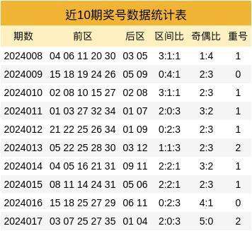 近10期前区的三区比为15:15:20,其中前3区出号数较多,1、2区前区出号数较少。上期前区三区比为2:0:3,3区前区表现较强。本期关注三区比3:1:1。