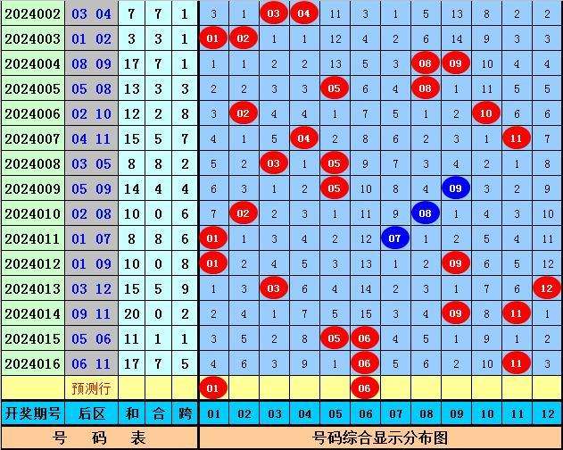 体彩大乐透第2024017期后区分析:后区上期开出奖号:06+11,奇偶比、大小比都为1:1,本期预计再出一奇一偶组合,关注两码01、06。