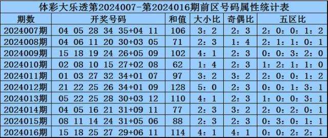 体彩大乐透第2024016期奖号为:15 18 25 27 29+06 11,前区奖号和值开出114,大小比为4:1,奇偶比为4:1,五区比开出0:0:2:2:1。