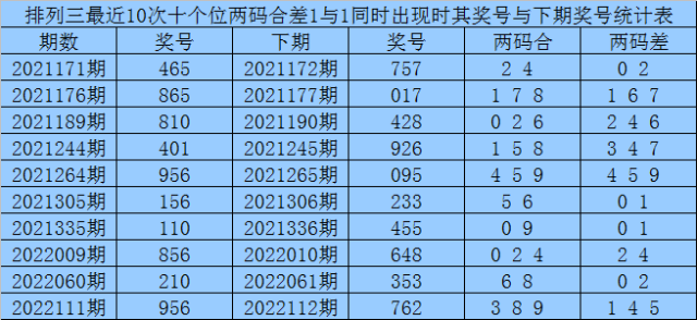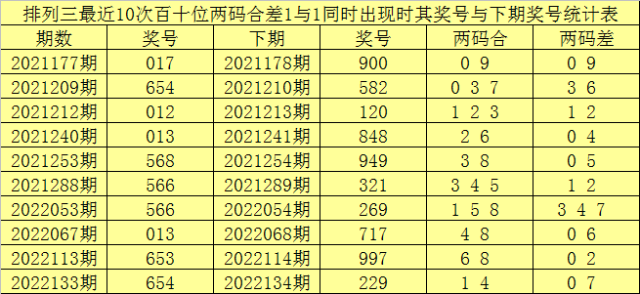 百十位合差分析:上期奖号百十位开出65组合,两码合为1,两码差为1,最近10次百十位两码合1与两码差1同时出现时,其奖号和下期奖号分别为: