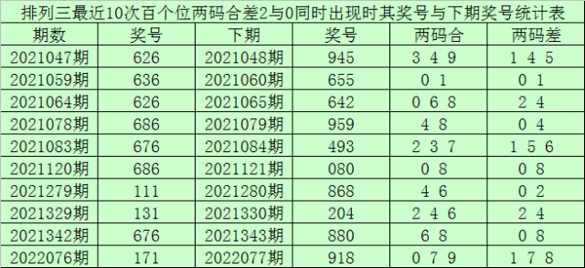 百个位合差分析:上期奖号百个位开出66组合,两码合为2,两码差为0,最近10次百个位两码合2与两码差0同时出现时,其奖号和下期奖号分别为:
