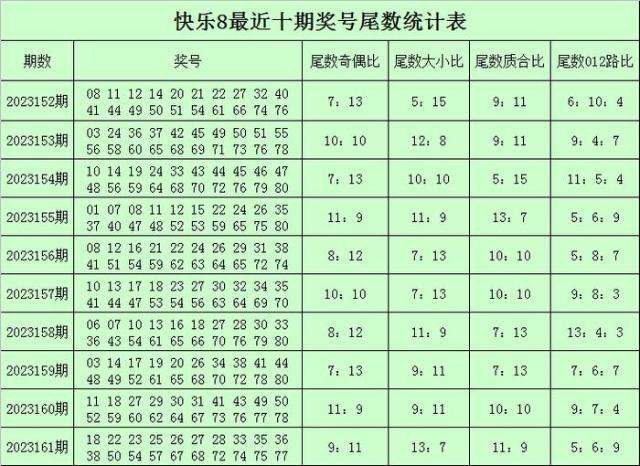 陆白秋快乐8第2023162期奖号尾数分析