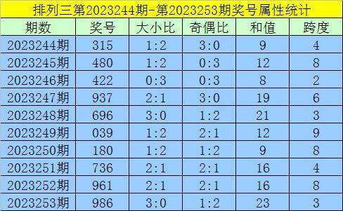 上期回顾:排列三第2023253期出现奖号986。开出组六,奇偶比1:2,012路比2:0:1,大小比3:0,和值23,跨度3。