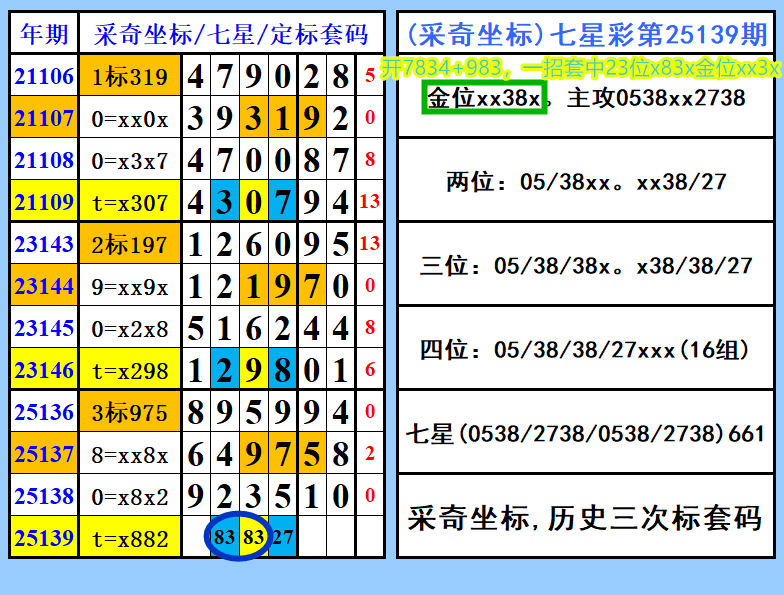 (采奇坐标)视频经典回顾,七星彩第139期,一招套中23位x83x金位xx3x