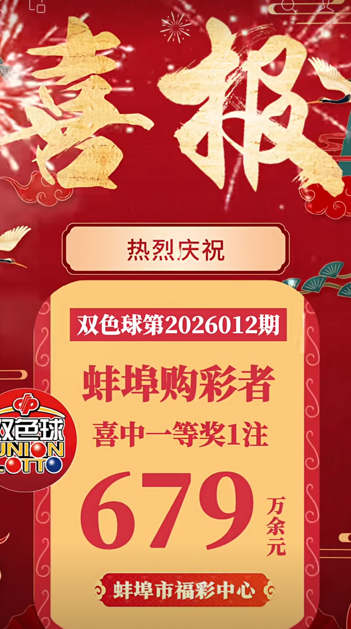鸿运当头!蚌埠彩民喜中双色球2026012期679万元一等奖 9小时前 177阅读