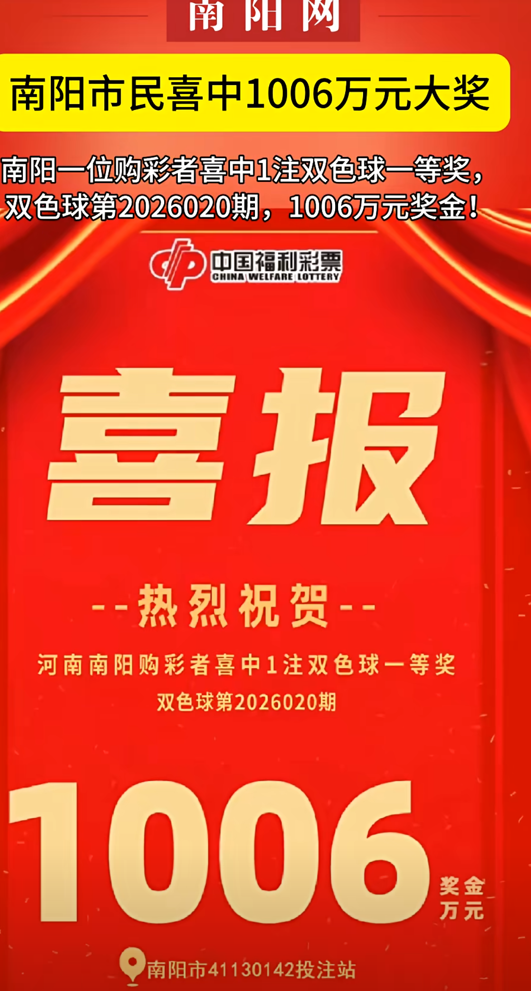 南阳彩民喜中双色球1006万元大奖,幸运之光点亮宛城 3小时前 57阅读